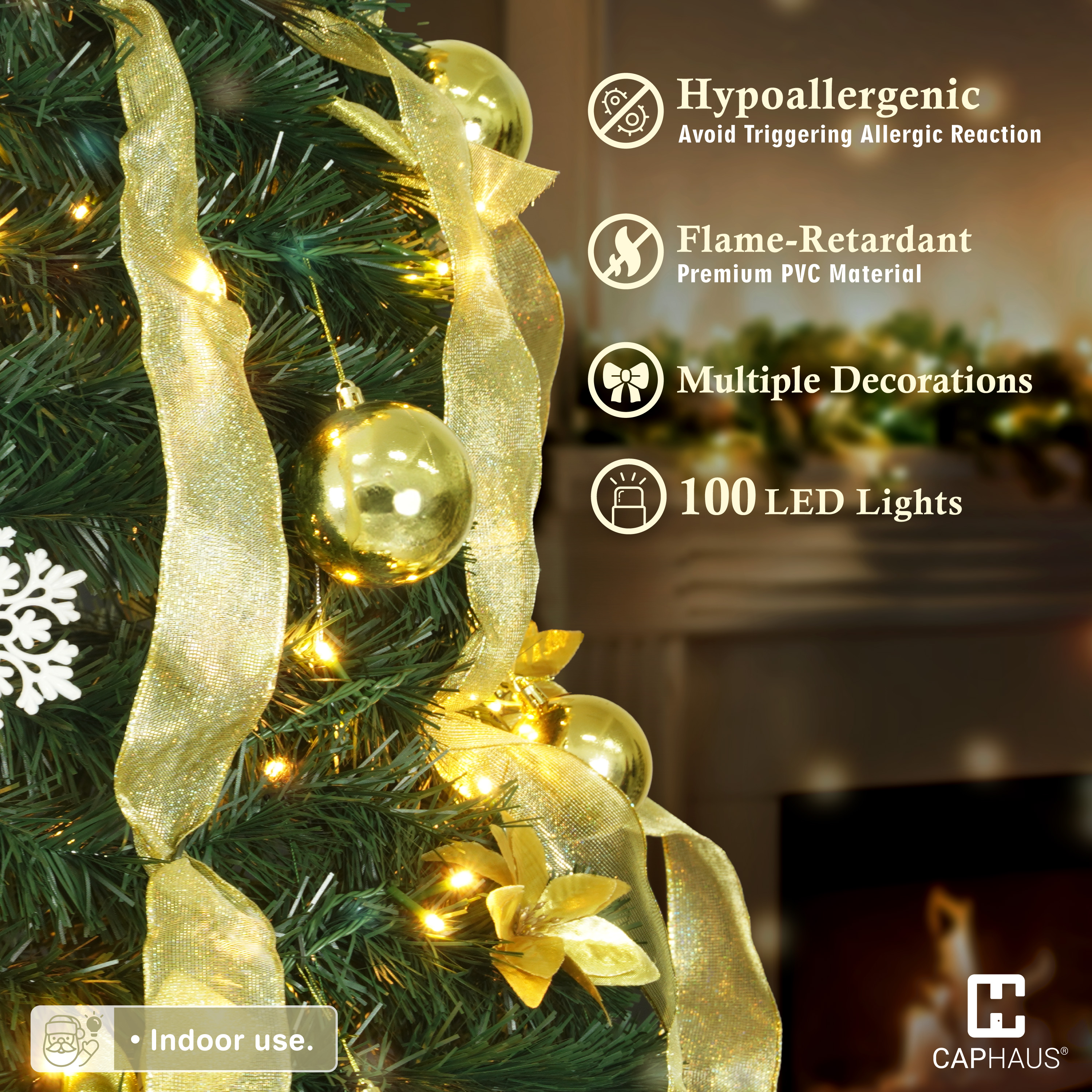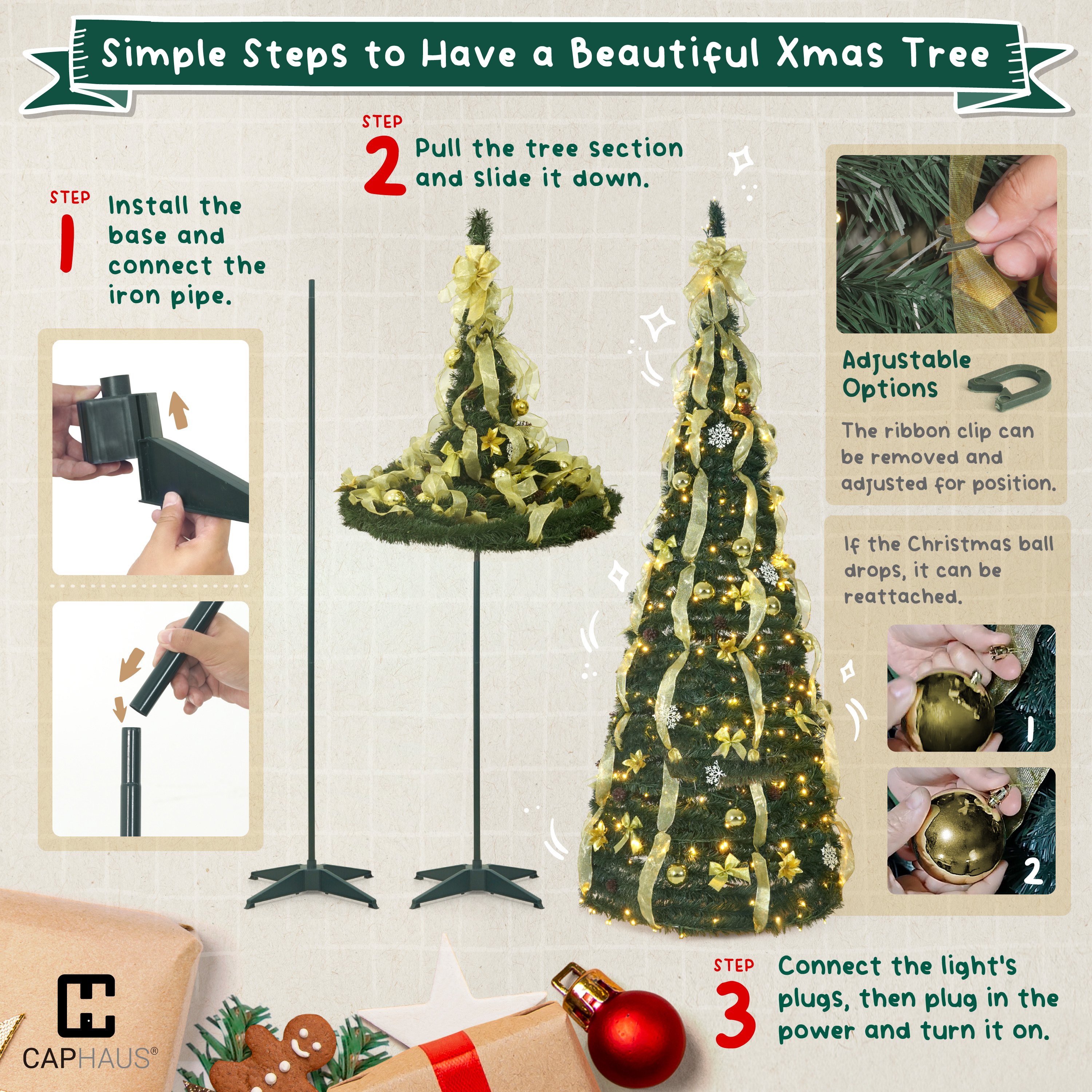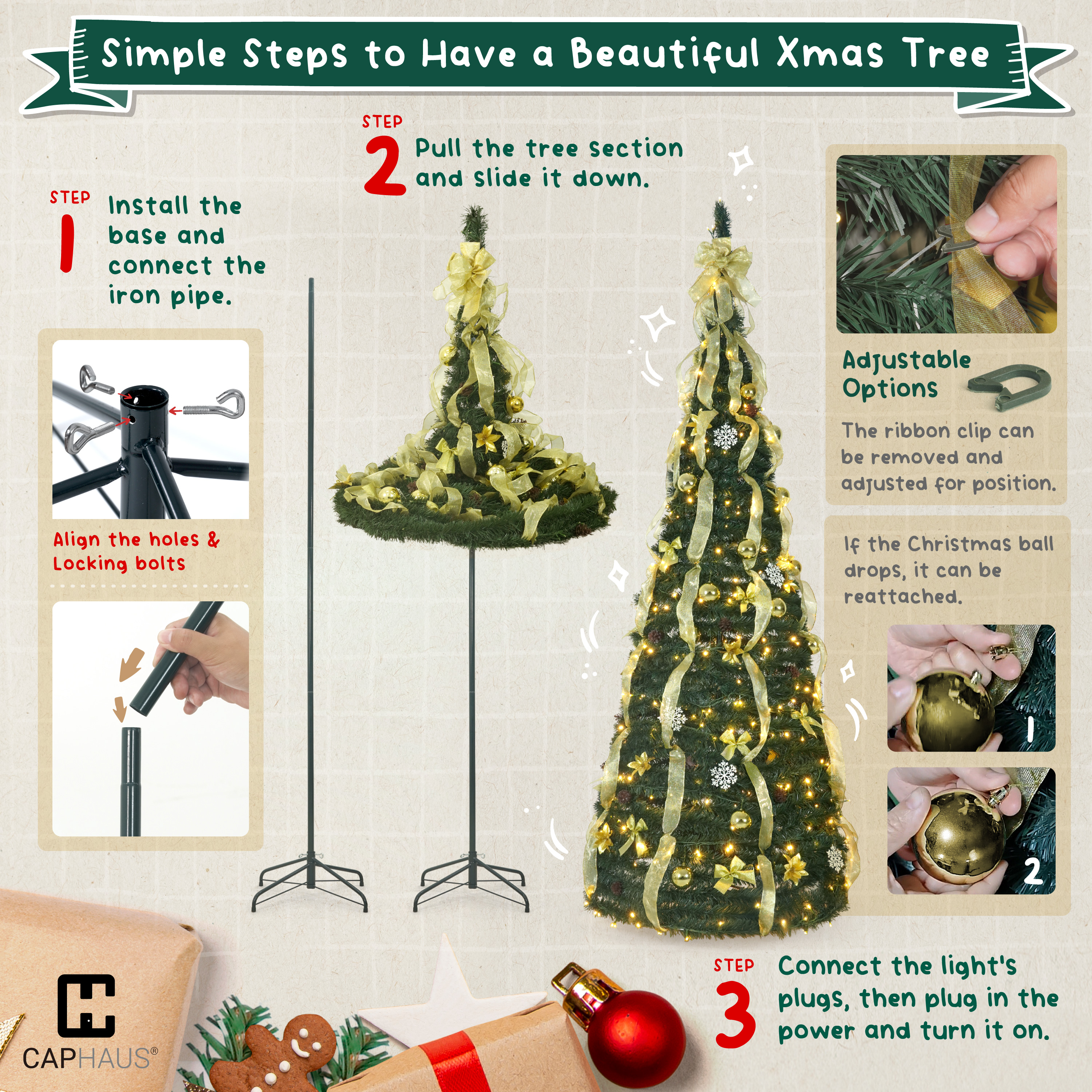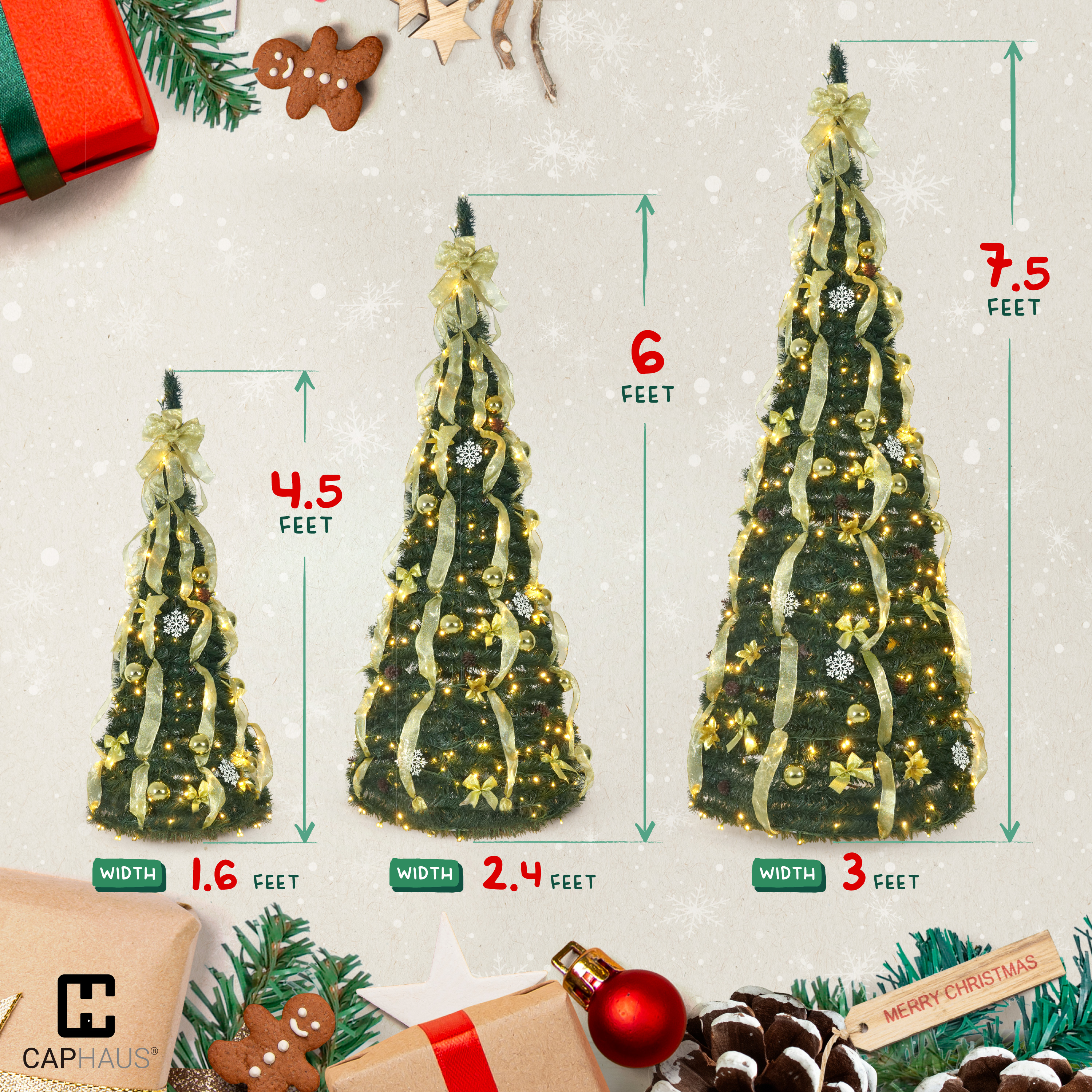 • Fully Decorated: This foldable tree brings the magic of Christmas to life by transforming from nearly flat to beautifully decorated in seconds; it comes pre-adorned with 100 / 300 / 450 lights, ribbon, bows, and ornaments
