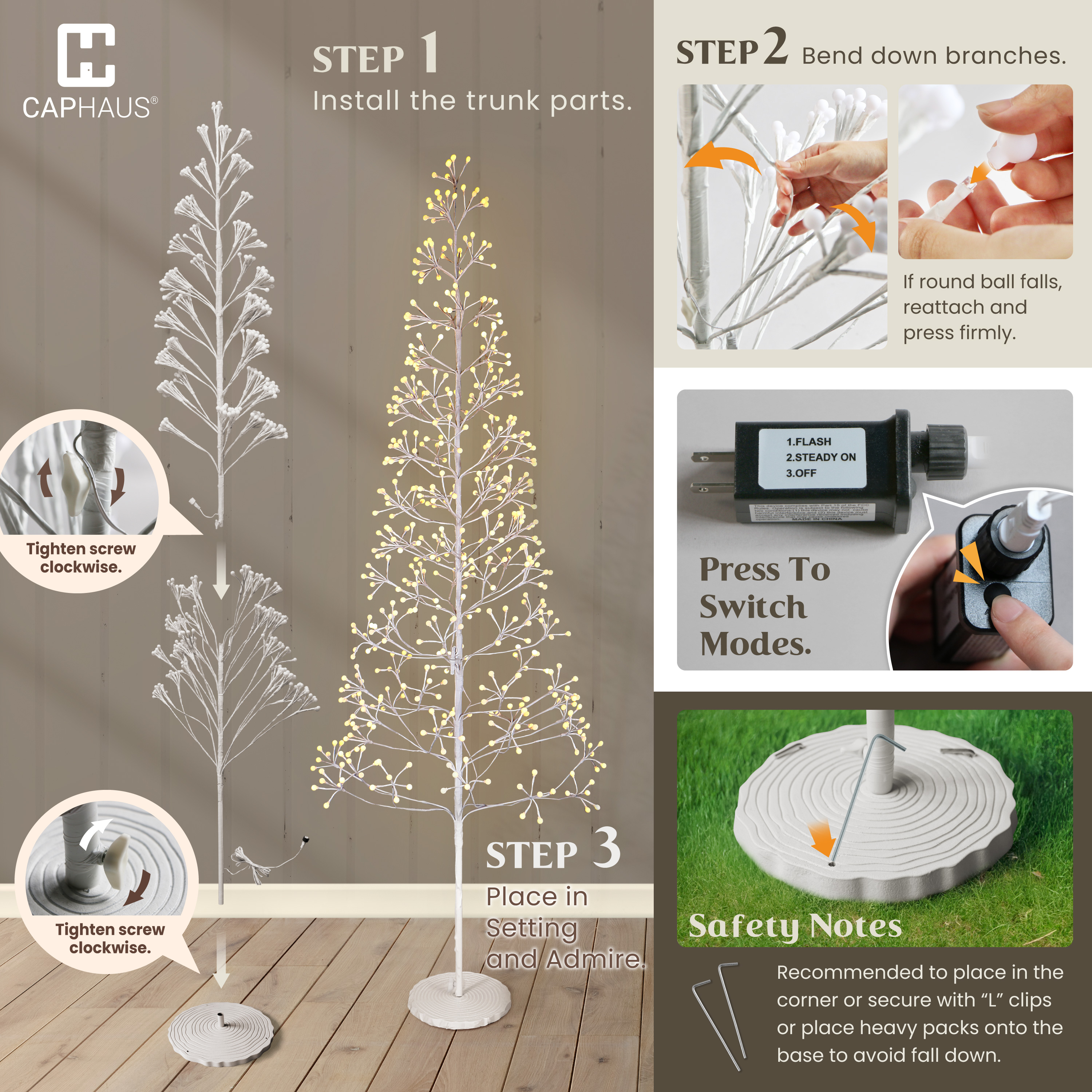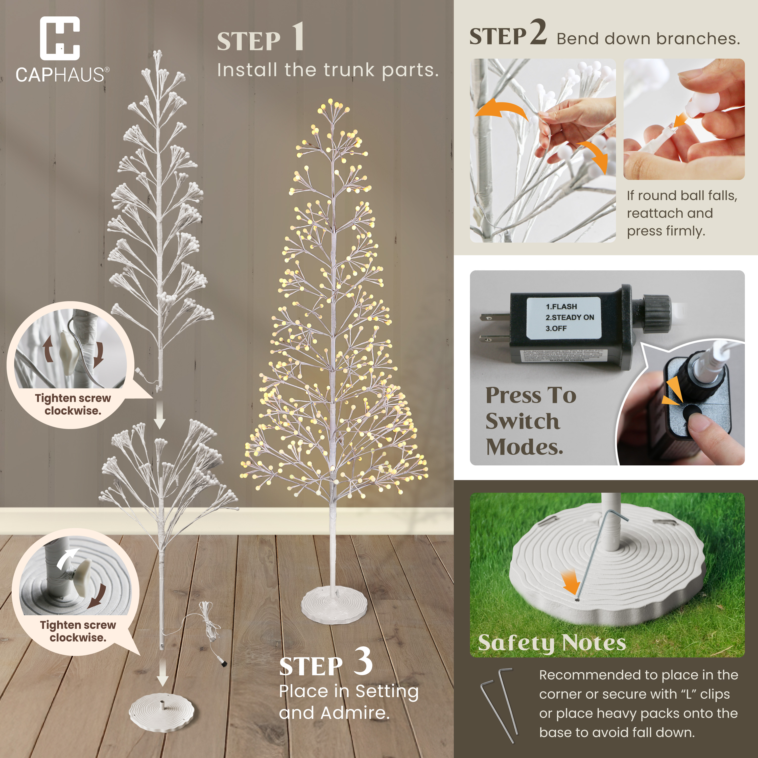 - Stable & Easy Setup: Assemble your 4/ 6/ 8 ft twinkling lighted trees in minutes; the 7.8” diameter white plastic tree ring base and three "L" clips ensure stable placement; recommended to secure with clips or place in a corner to prevent tipping