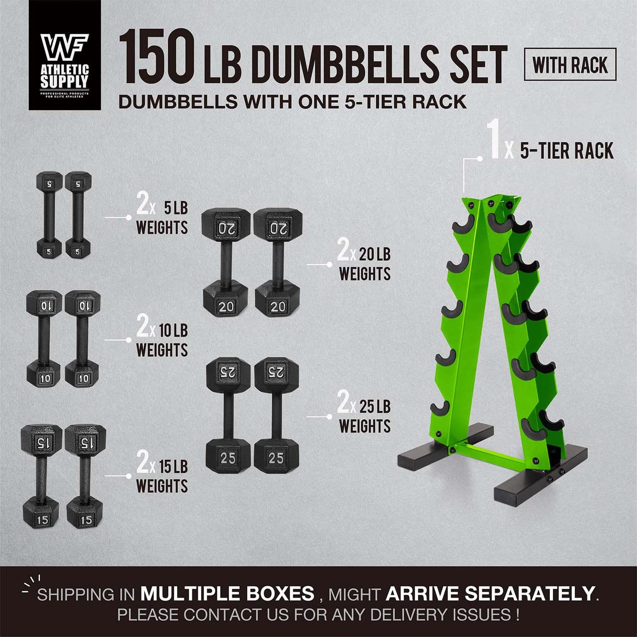 - Set Includes – A pair of 5-pound, 10-pound, 15-pound, 20-pound, and 25-pound black cast iron solid hex dumbbells with an A-frame dumbbell rack to store the weights. Storage Rack Color Options Available. Notice - This set ships in multiple boxes, and it might arrive separately on different days. Please feel free to contact us through Amazon message center for any package missing or delivery issues! We're here to help!
