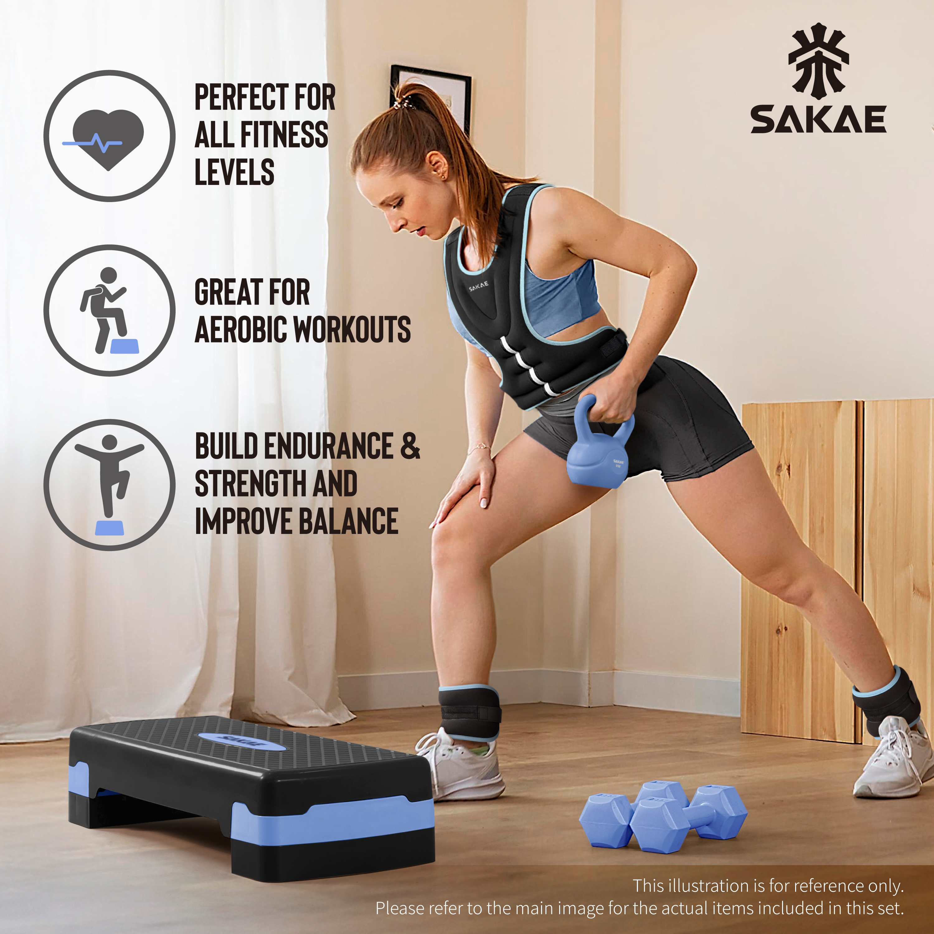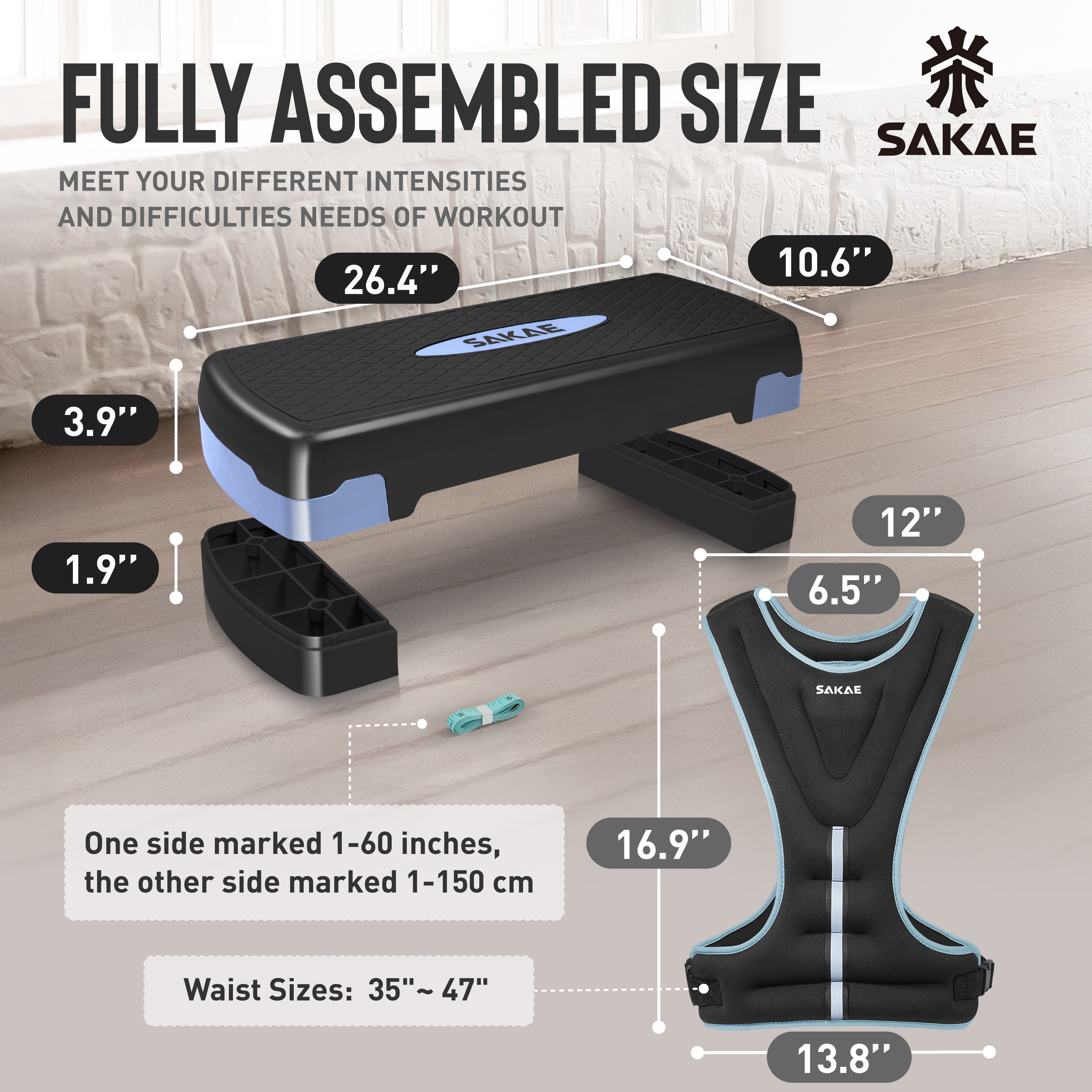 - All-in-One Workout Set: Aerobic stepper is designed with a diamond-textured surface for enhanced traction; four non-slip feet ensure stability and help prevent floor damage; set includes black stepper, 8 LB weighted vest, and measuring tape