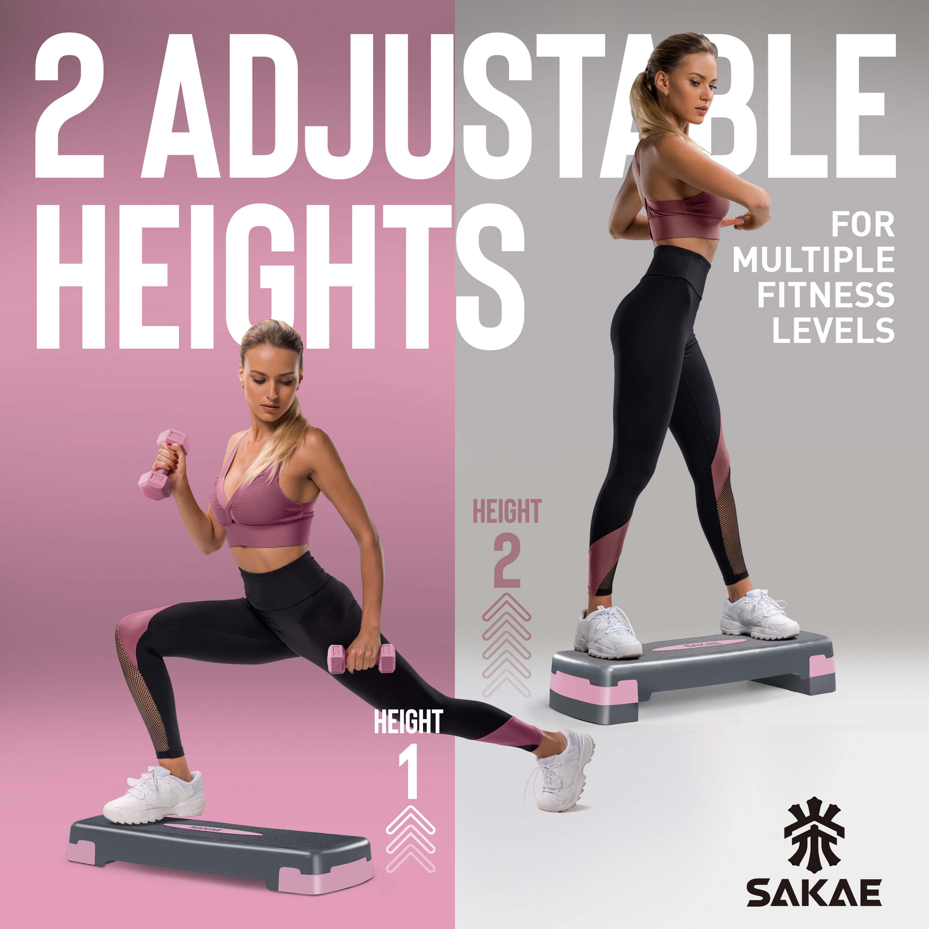 - 2 Adjustable Height Levels: Comes with 2 risers to adjust platform height between 4” and 6”; ideal for customizing workout intensity and increasing calorie burn; equipped with a black step platform; overall dimensions are 26.4” W x 10.6” D x 3.9–5.8” H