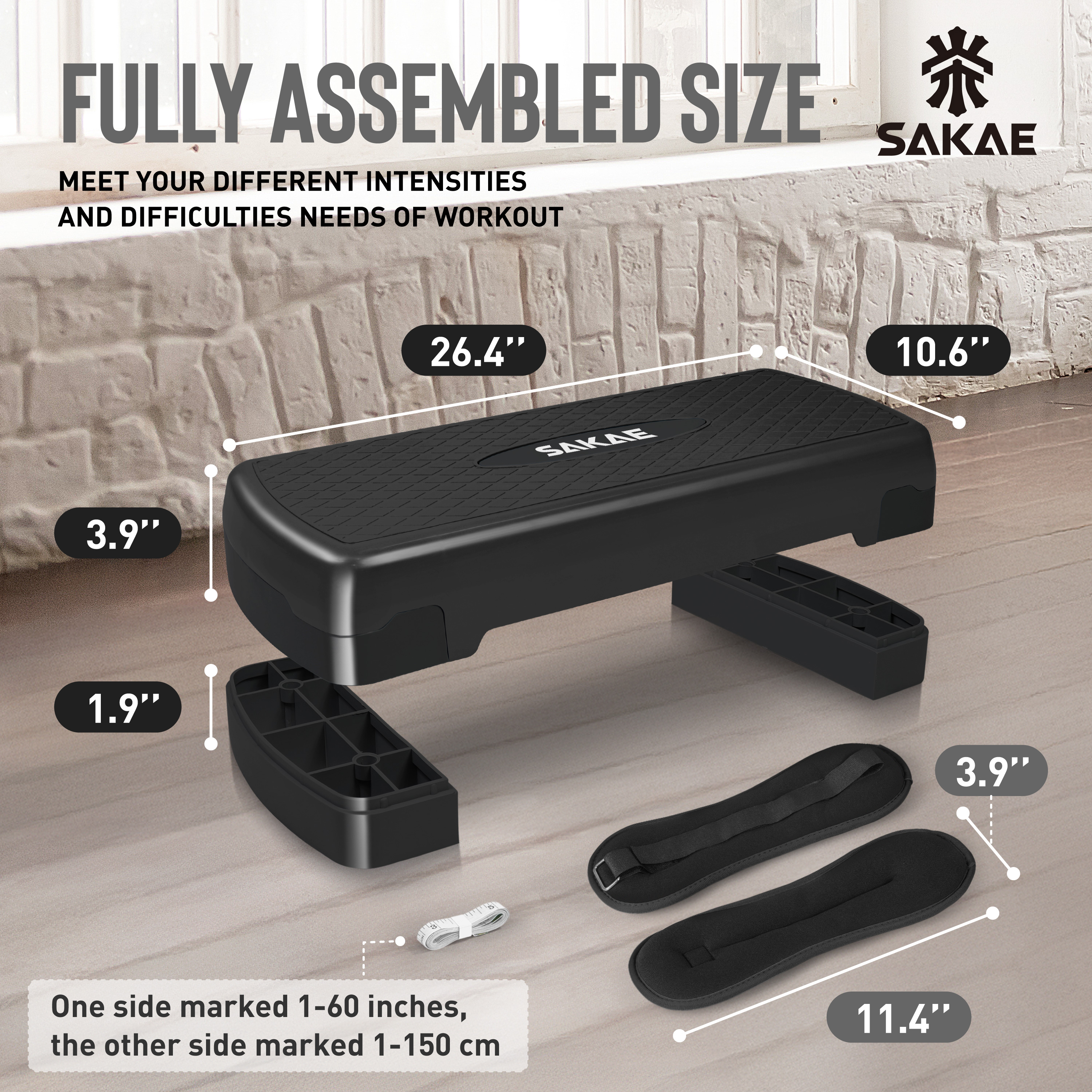 - All-in-One Exercise Set: Step platform features diamond-textured surface for secure grip; four non-slip feet add stability and protect floors from scratches; set includes black stepper, two 1 LB ankle weights (11.4” W x 3.9” D), and measuring tape