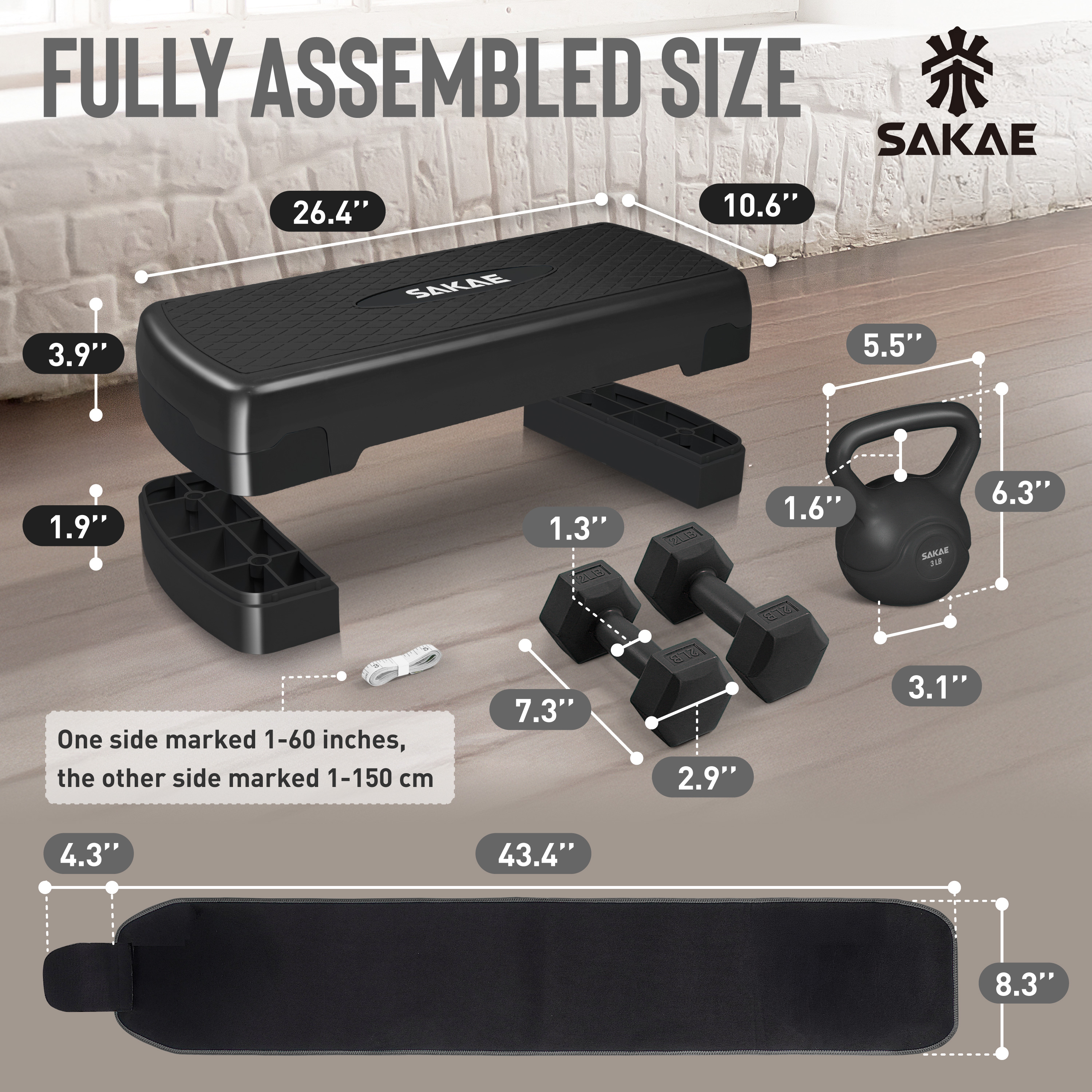 - Complete Workout Kit: Diamond-textured surface offers secure grip; non-slip feet ensure stability and protect floors; black set includes stepper, two 2LB dumbbells, 3 LB kettlebell, 43.4” W x 8.3” D waist trimmer, and measuring tape